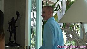 Muscular guy handles two petite brunettes in 3-way with Jordanne Kali. Group action unfolds.