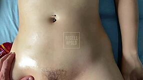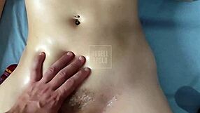 Skinny busty girl gets oiled tits and buttocks at massage