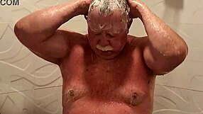 Grandpa strips naked flashes huge cock in sexy shower solo show