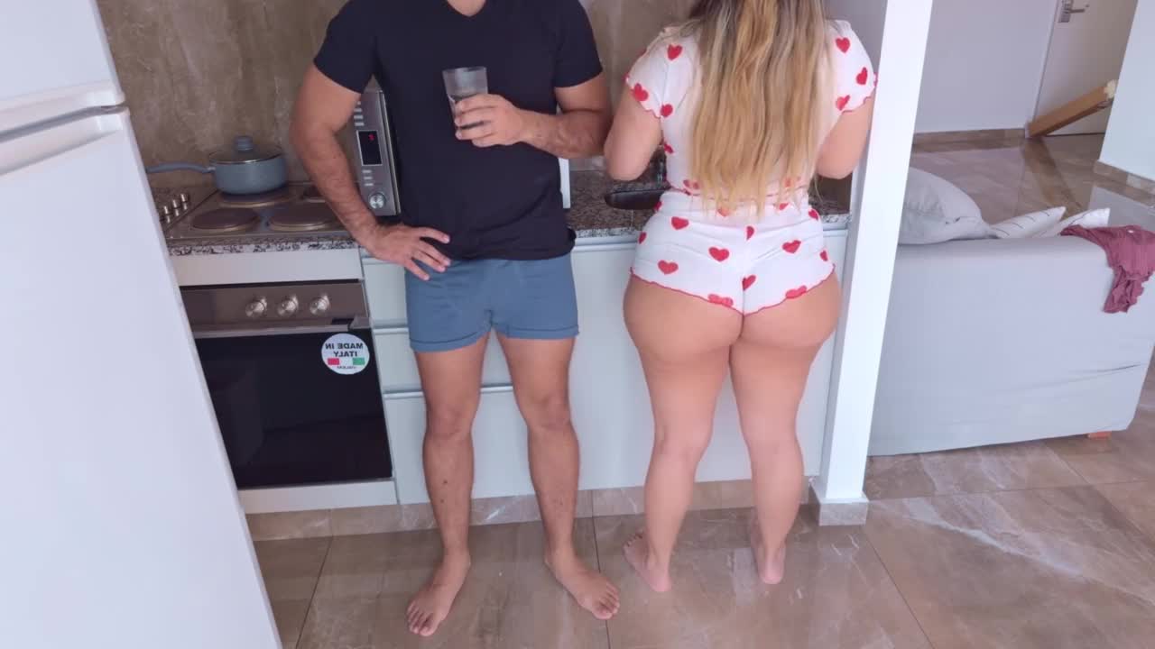Wife Cheats on Husband with Teen Threesome Blowjob and Cumshot Under His Nose While He Cooks Dinner! What a Taboo Cuckold Surprise!