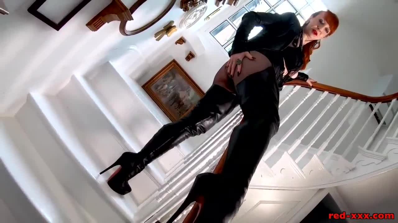 Gothic Brunette in Leather Boots Plays with Big Pink Dildo