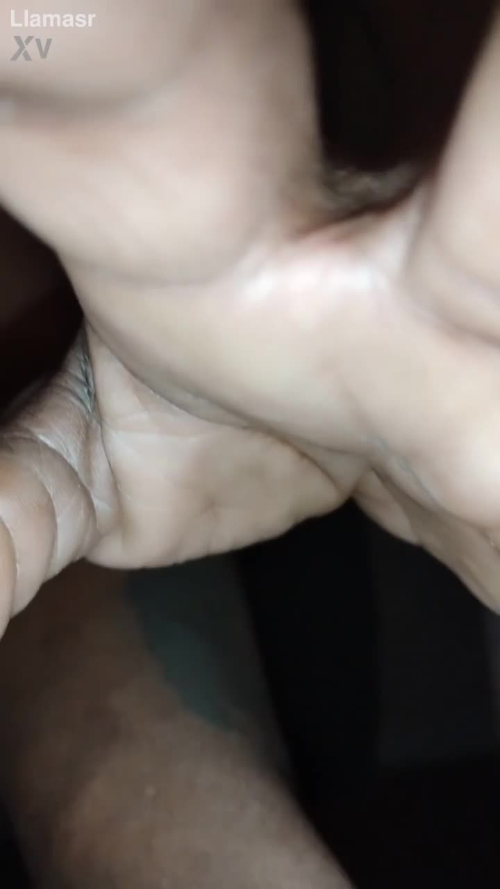 black haired slut with big tits spreads legs for cumshot on her sexy feet