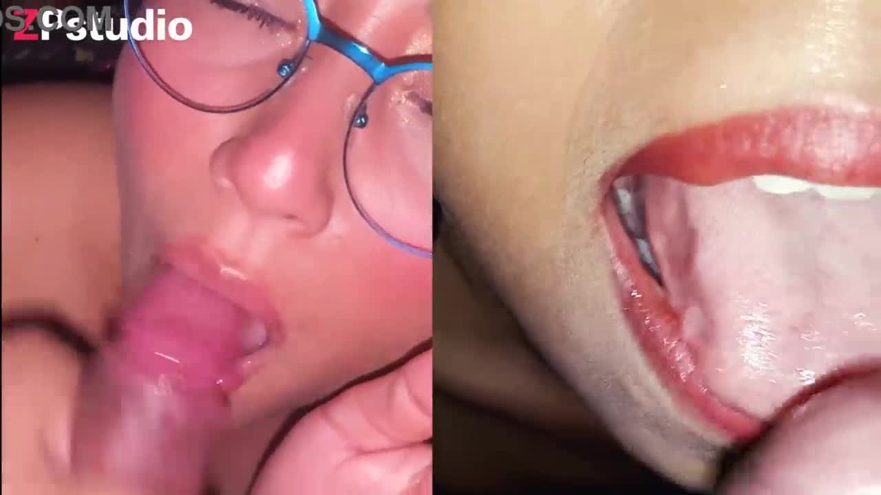 Slutty Brunette Sucks Geek Guy's Big Cock and Gets Creampied with Cum Dripping Out
